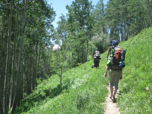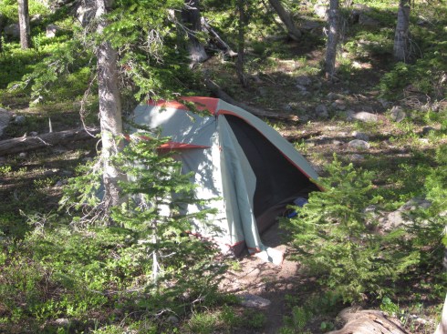 At about the time the last picture above was taken, my legs and my mouth were cursing at the never-ending hills on this trail. The highest point of the trail is 10,300 ft – starting at 8,500 ft – an elevation gain of 1,800 ft, which isn’t that bad except when you’re 1) not in backpacking shape and 2) doing hard workouts all week for triathlon training. My legs were just so tired. I have never felt like that on a hike before (well except for the first time I went backpacking, but I’m in a lot better shape than then. Last year, we did 30 miles in 3 days but they were flat miles. I hate hills!)