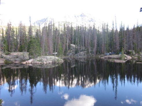 After a breakfast of oatmeal and Strawberry Goober, we hiked down the stream that flows out of the lake to go fishing (I went to go reading). Actually, after contemplating an entire day of reading, I decided I would try my hand at fishing. Three casts in, I snagged my line on a rock or log and Travis broke the rod trying to get it un-snagged. Fishing FAIL. That is why I just shouldn’t fish. The universe was telling me something.