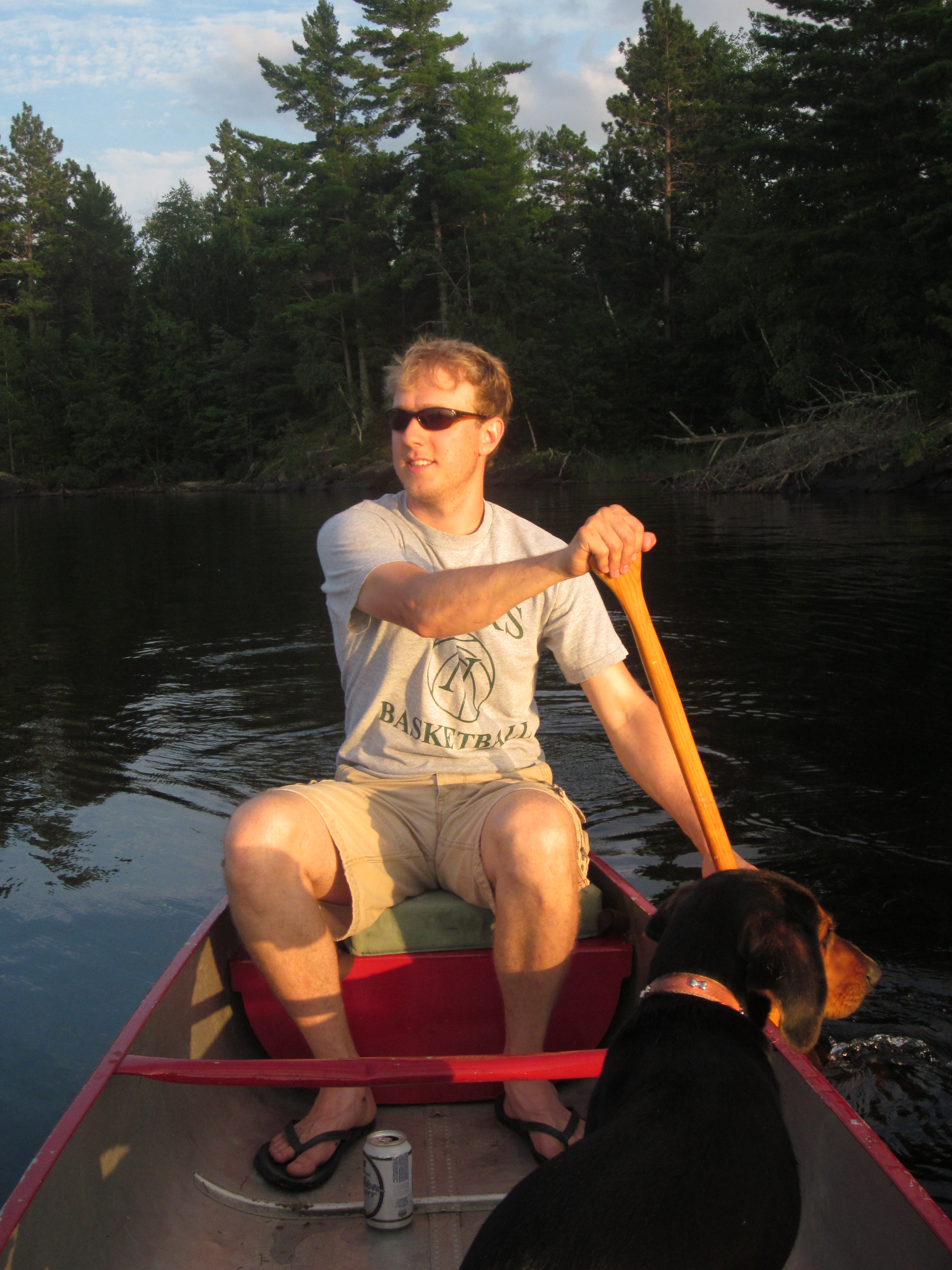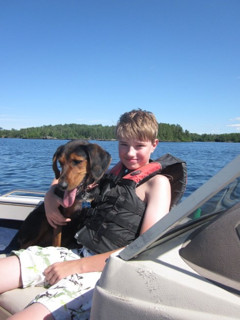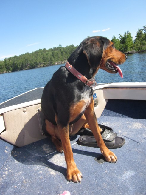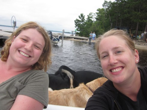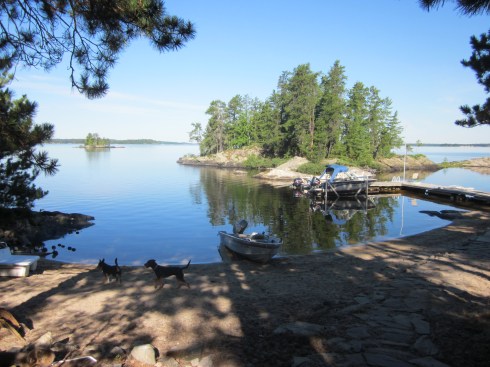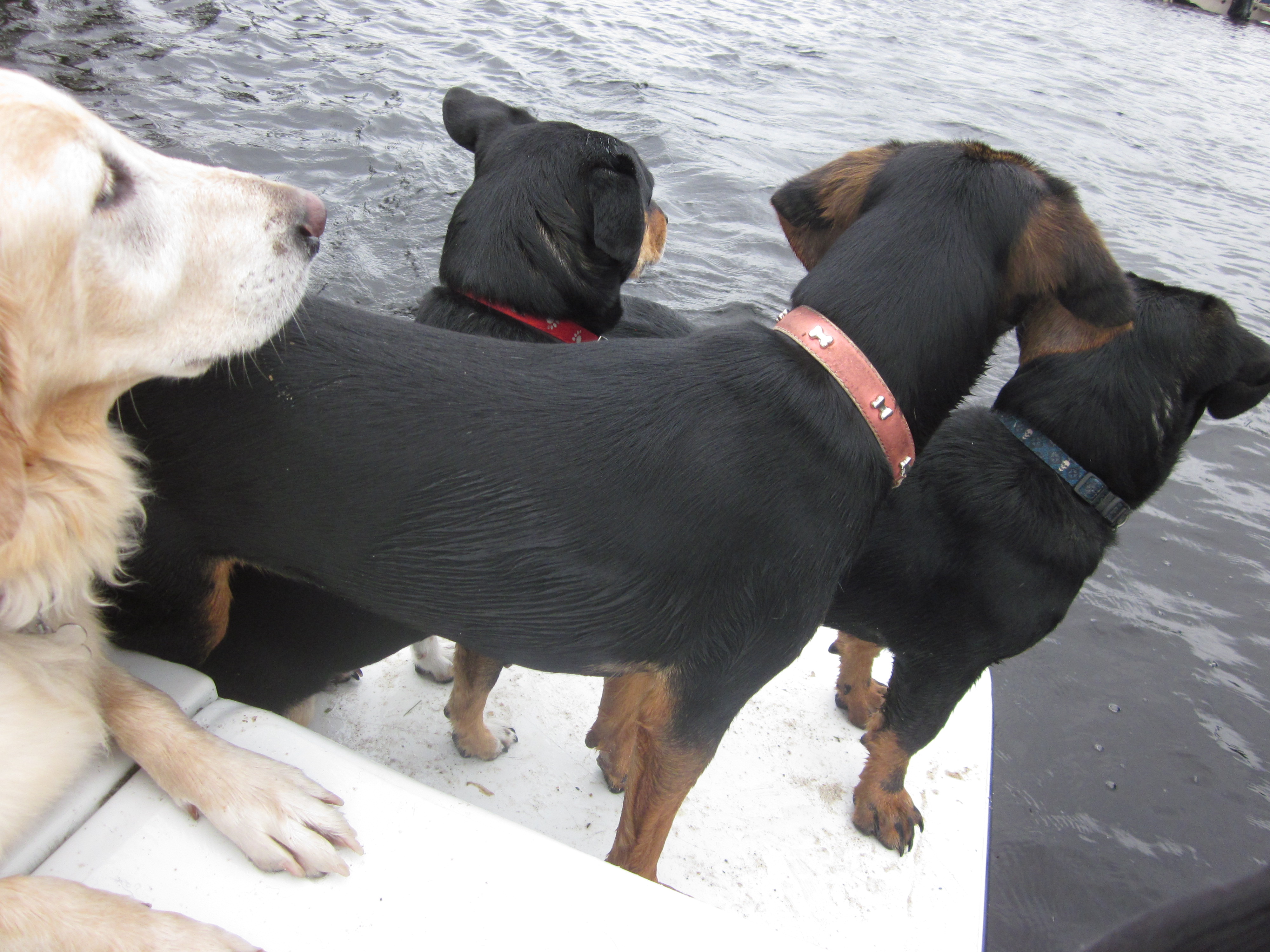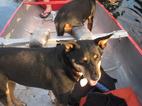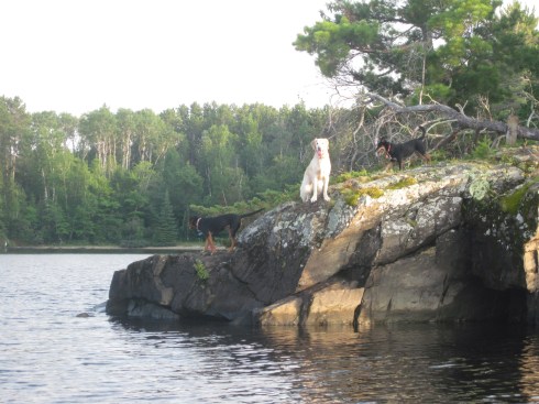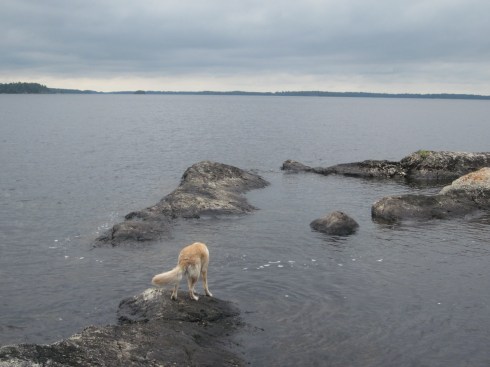 After a lunch of delicious fish, Carolyn and I took the paddleboat out to Fish Island to pick some blueberries. Of course, we had to take the dogs with us (Carolyn has two dogs adopted from humane societies as well – one a golden retriever, the other a Rottweiler mix).