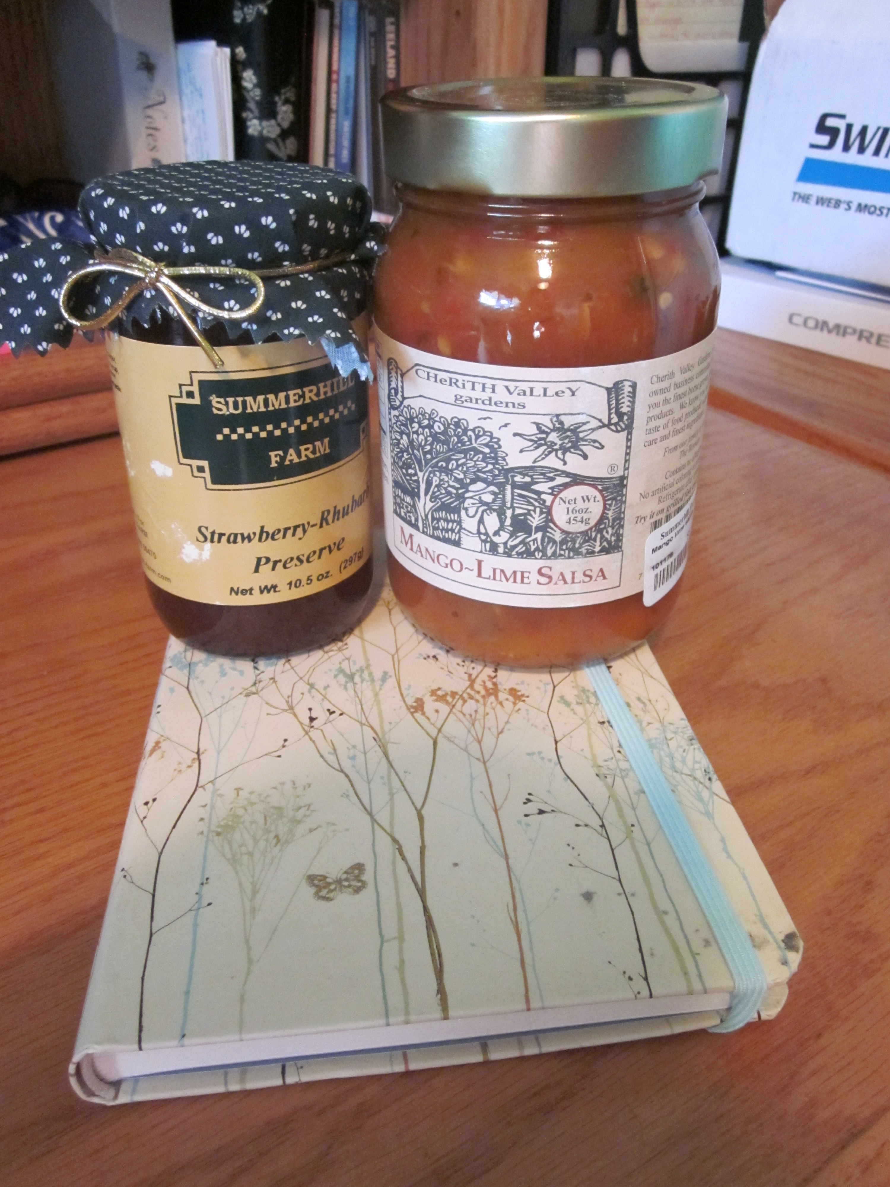 The jam was made locally in Park Rapids but the salsa was made in Texas. No matter – it’s delicious and has a nice kick. I mostly bought it for Travis, who loves salsa. And the journal was just too darn cute to pass up (some of the trees are actually shimmery gold).