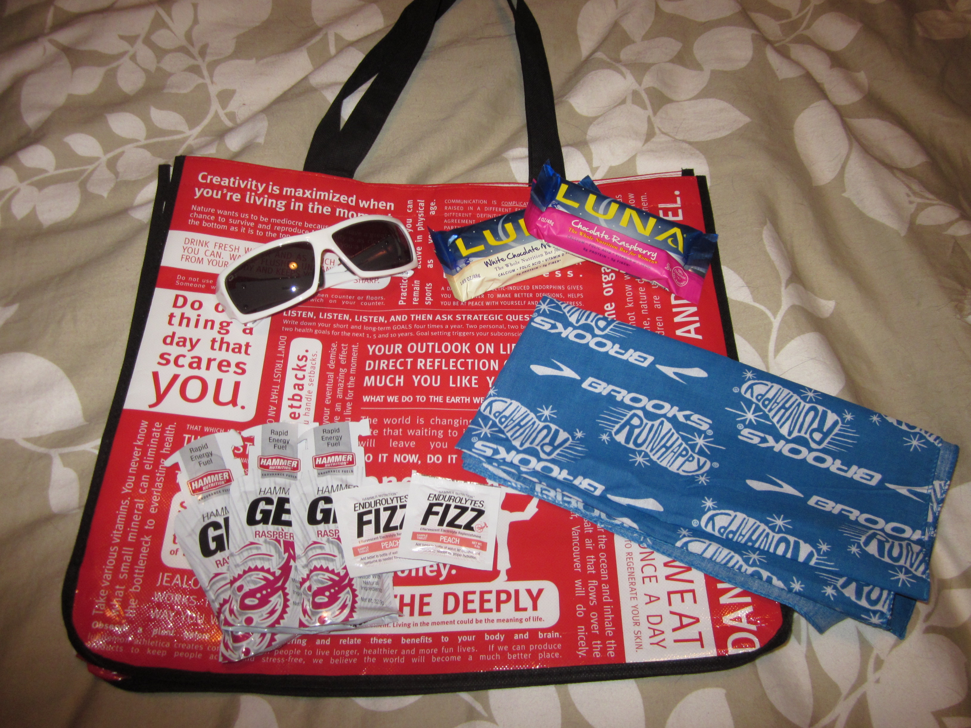 A lululemon tote bag, 2 Luna bars, 3 Hammer gels (raspberry), 2 Hammer electrolyte tablets, a Brooks bandanna, and a pair of RedStar WorldWear polarized sunglasses.