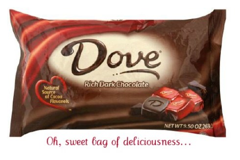 2. Eating chocolate every day is not bad. When this goal is over, I am going to buy some dark chocolate Dove squares and allow myself to eat one every night after dinner. Seriously, all I need after dinner is that sweet little flourish to signal the end of eating and since it is sorely lacking in this month of deprivation, I have been wanting to find something else that will even just come close. There is nothing. I just want chocolate. And since one dark chocolate Dove square only has 42 calories but contains healthy antioxidants and satisfies my sweet tooth, I think it’s totally justified.