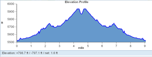 My run today start at 5500 feet above sea level, climbed to 5900 feet over 4.5 miles, and ended back at 5500 – total gain/loss of 400 feet (not to mention the additional 5000 feet above sea level). I climbed 50 more feet in less than a third of the distance. If I keep this up, I’m going to be kicking those hills’ a$$, instead of the other way around (which is the whole goal)!