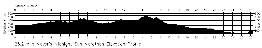 From what I can tell, the Mayor’s Marathon starts at 200 feet above sea level, climbs to 550 feet over 15 miles, and then ends at about 100 feet – a total gain of 350 feet and loss of 450.