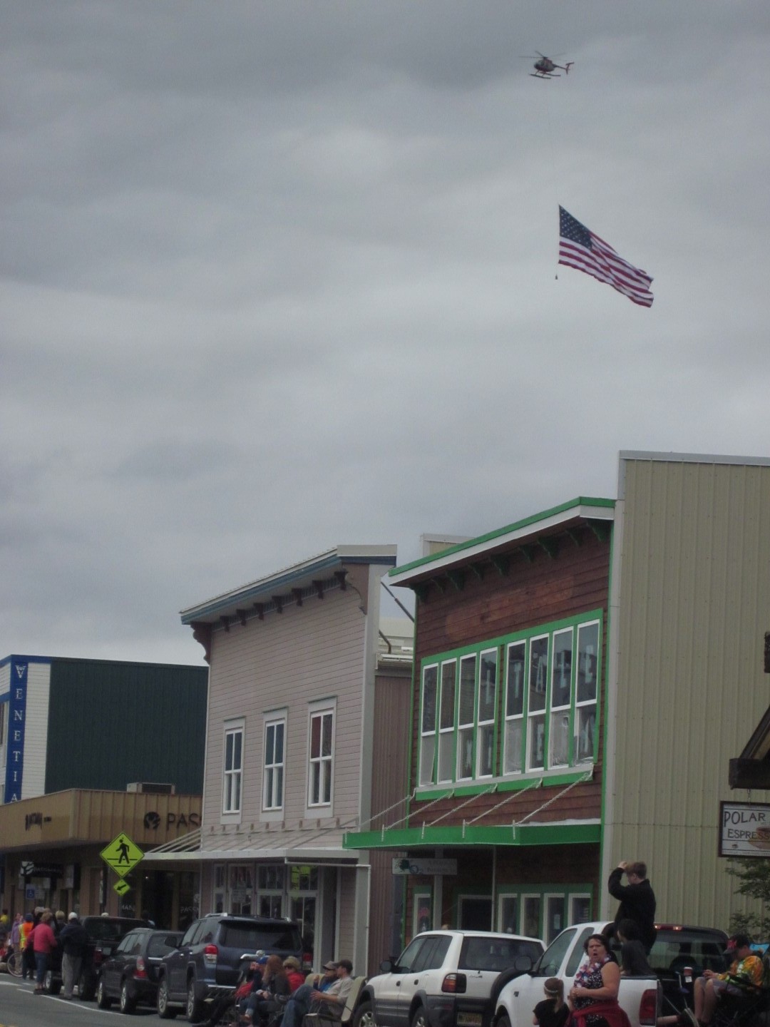 Al, Matthew, Kurt and Marlene met us in front of the fire station to watch the parade. It started with a helicopter flying with the American flag.