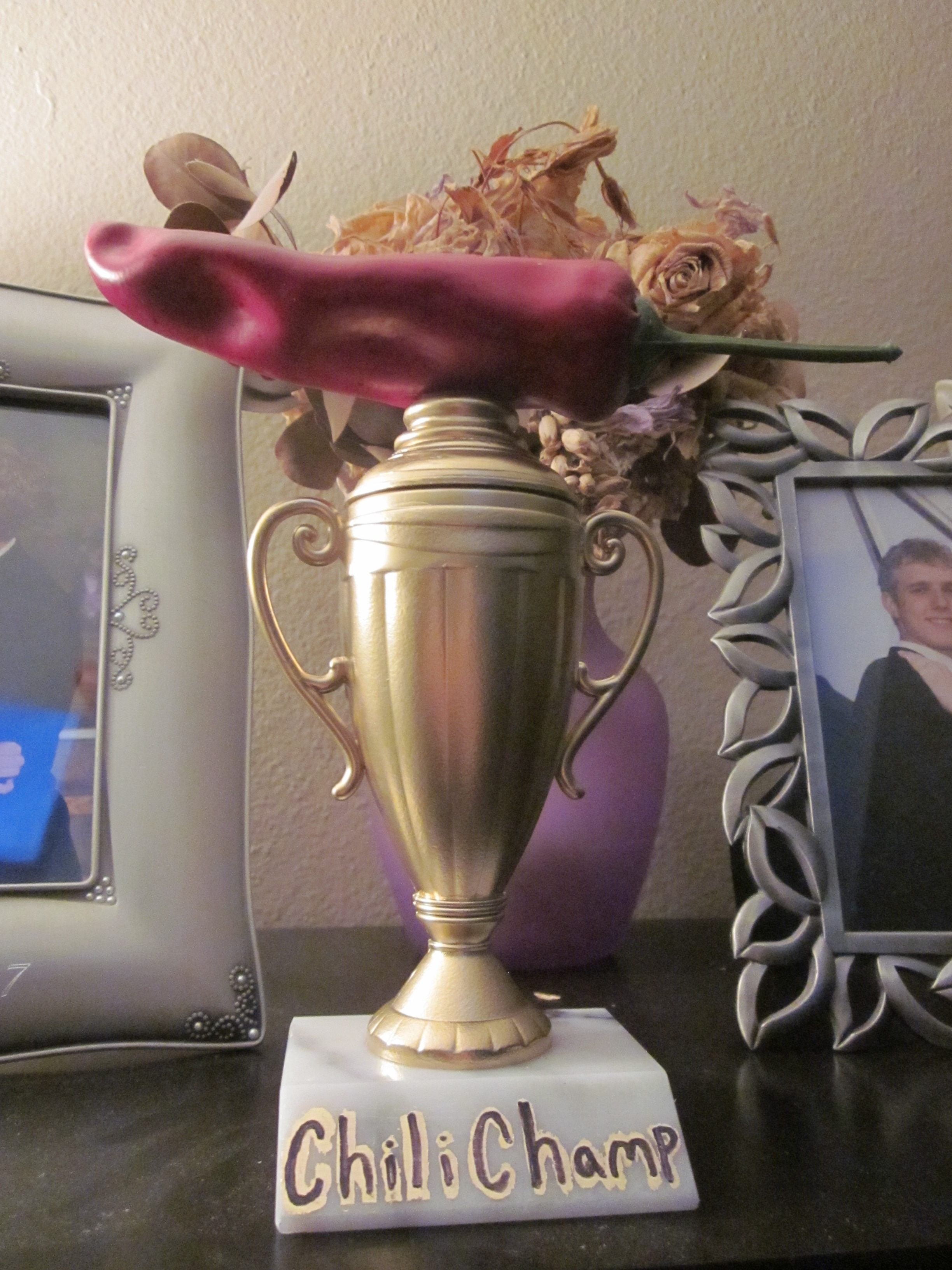 Yesterday was our church’s annual Chili Cookoff for singles and young married couples. Travis and I brought our award-winning Elk Chili (we entered it in 2010 too and won). And we won again! The Chili Trophy is now proudly displayed on our bookcase.