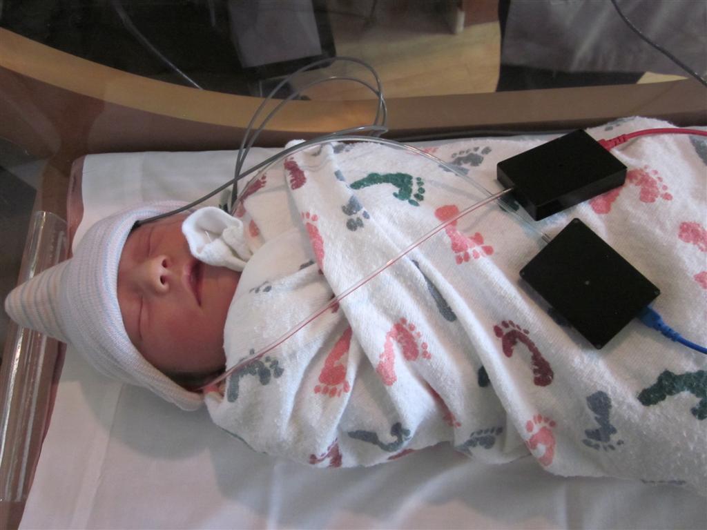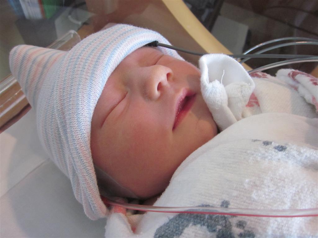 Emma wasn’t interested in breastfeeding right away – she was gagging and coughing up bubbles a lot. Later on Sunday, one of the nurses suggested that we put a tube down her throat into her stomach to get some of the gunk out that she likely swallowed during birth. We agreed, though it broke my heart to think about her enduring that, but I’m glad we did it, because she had about 10 ccs of air and a bunch of amniotic fluid mixed with saliva in there. The procedure didn’t clear things up completely right away but we noticed she was much more content and willing to feed.
