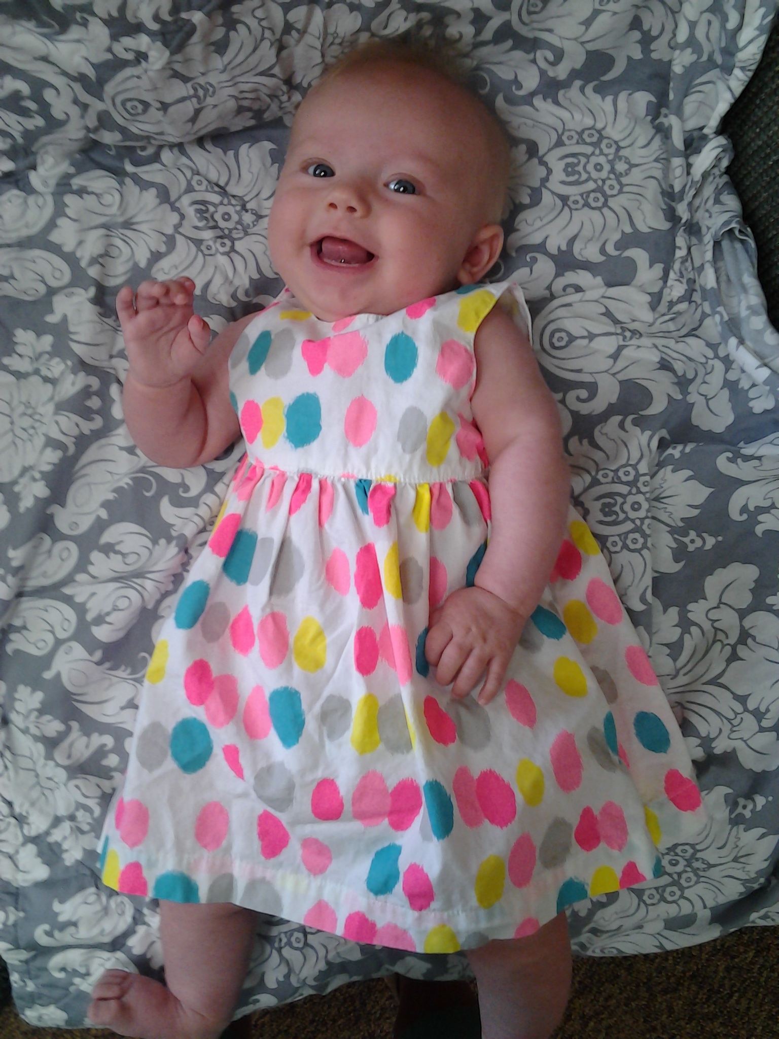 20130811_100633She ended up getting a little bit of diarrhea and irritability from her shots. She had a really bad night of sleep after her appointment – woke up several times, and then wouldn’t let me put her back down starting at 4 am. So I had a very early morning. It was a triple whammy because Travis was gone on a work trip AND I had to work. The diarrhea cleared up after a day or so, and she went back to sleeping well at night after that first night. But I am going to schedule her appointments for Fridays from now on, so that I can be with her for those fussy days and not have to go to work on 5 hours of sleep.