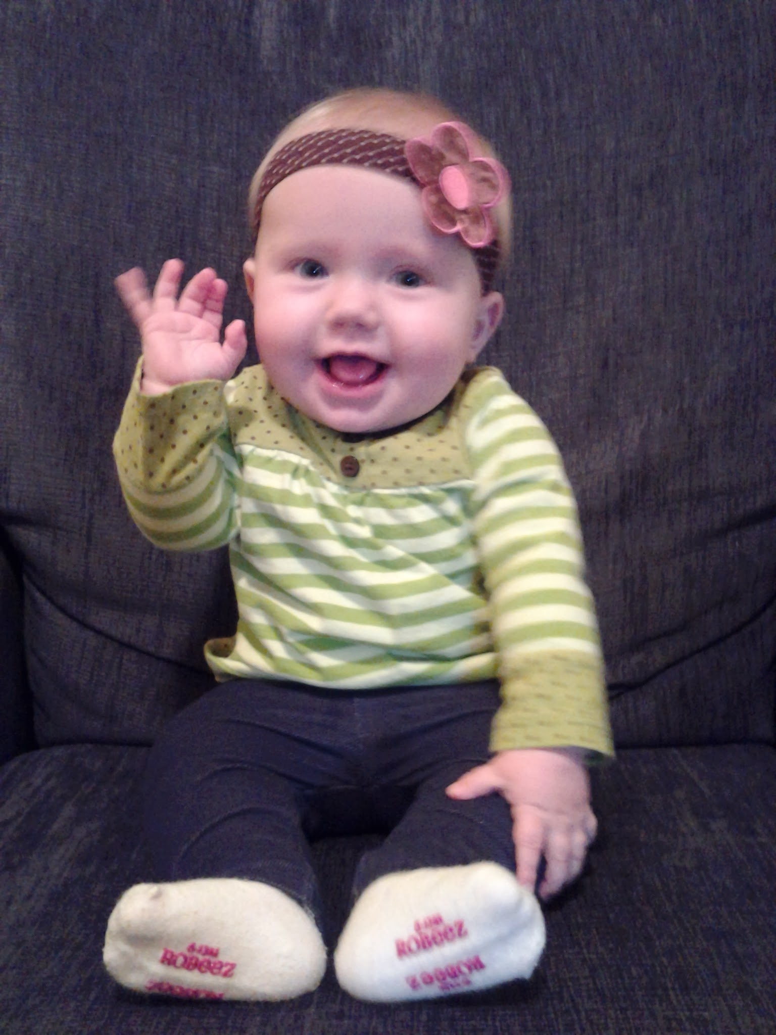 Her feet are finally big enough for her 3-6 month shoes, but she loves to kick her heels against whatever she’s sitting in or laying on, so the shoes (and socks) last about a minute before they’re off.