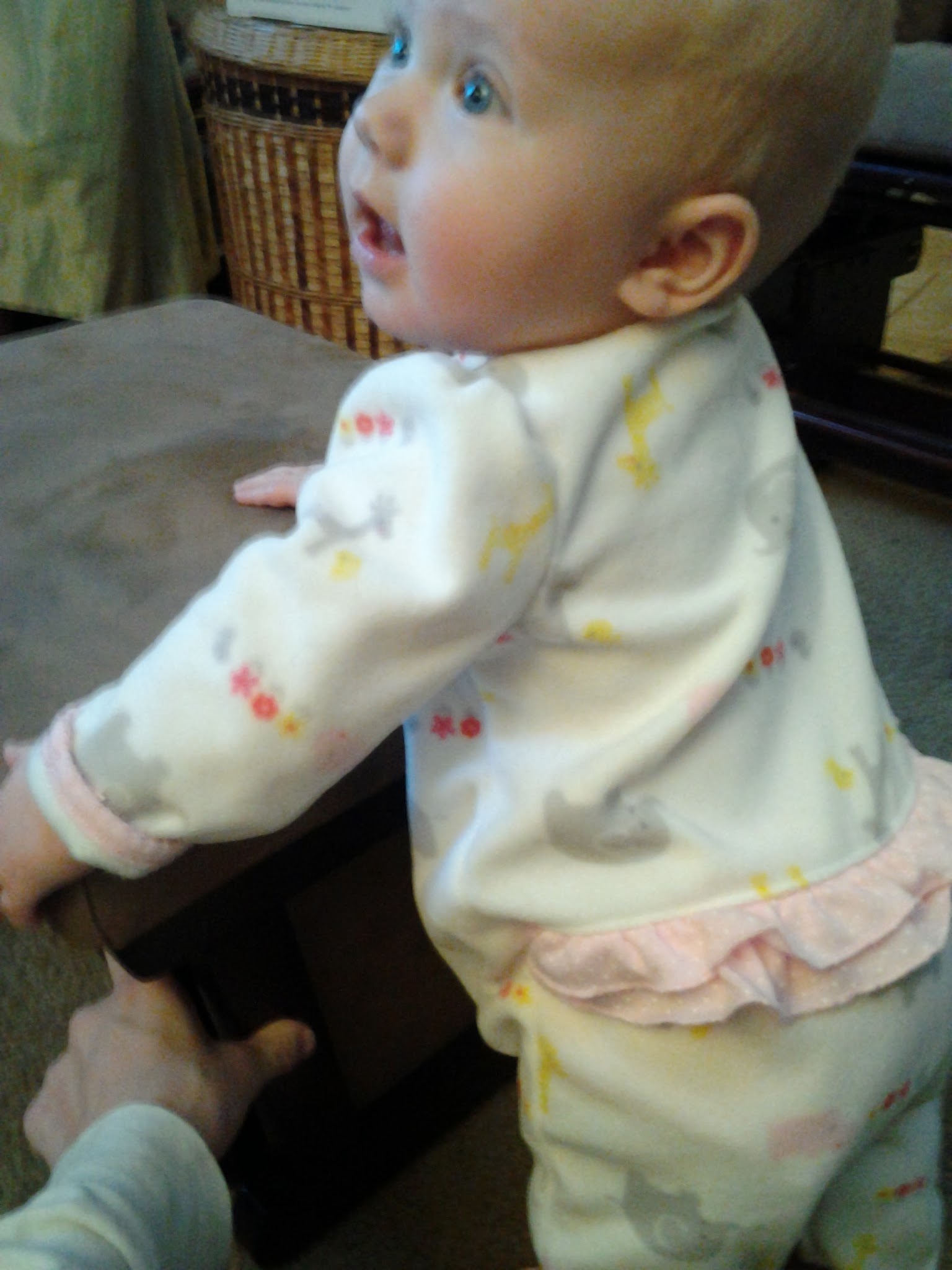 20131101_094152She also loves standing, and can stand up briefly on her own by holding onto furniture. She can’t get herself up to standing, but she can stay there for a bit! I always get a kick out of her standing – she looks so small, and so big, all at the same time!