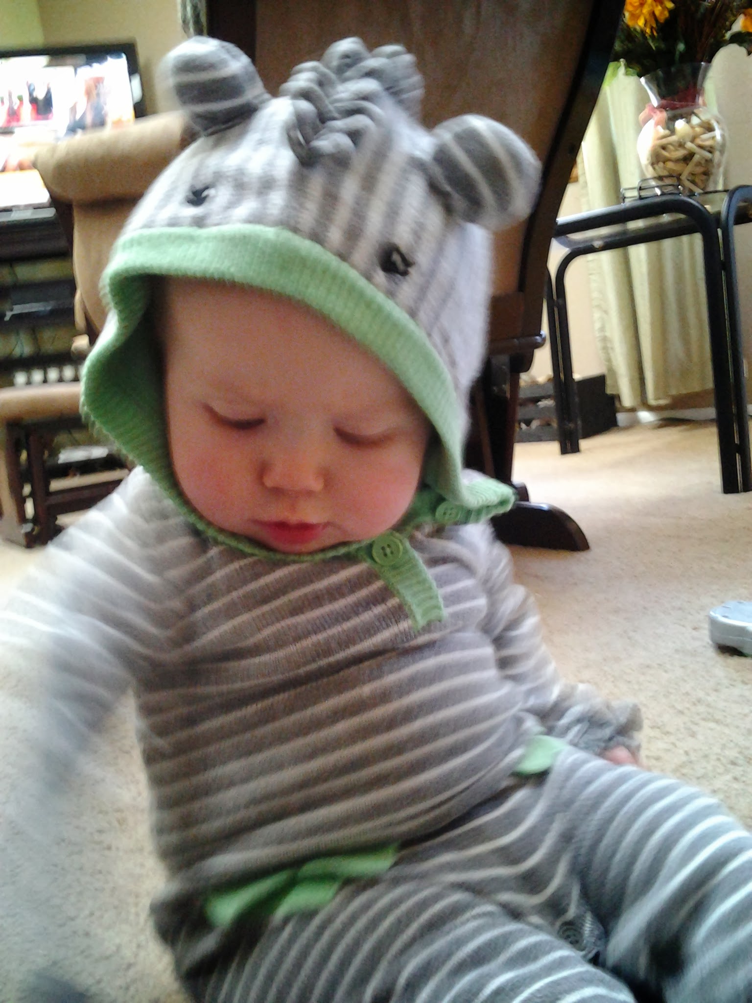 Emma is wearing almost all 12-month clothing now, though a few of her longer 9-month things still fit. She’s still wearing size 3 diapers, but I bought some 4s to see if they fit better. And that’s all I know since she doesn’t go back to the doctor until 12 months.