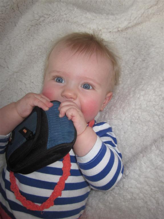Emma got one new tooth this month – looking at her, it’s the one to the left of her 2 big teeth on top. It’s just a mini me! I think she might be in the process of getting a few more too, but we’ll see. We started giving her Motrin instead of Tylenol for the teething pain because our pediatrician said that Motrin lasts longer and isn’t hard on the liver like Tylenol is. We also put a little teething gel on the sore spots if she needs it. It’s not recommended due to swallowing issues, but I just nurse Emma afterward and figure if she’s fine then, she’ll be fine later.