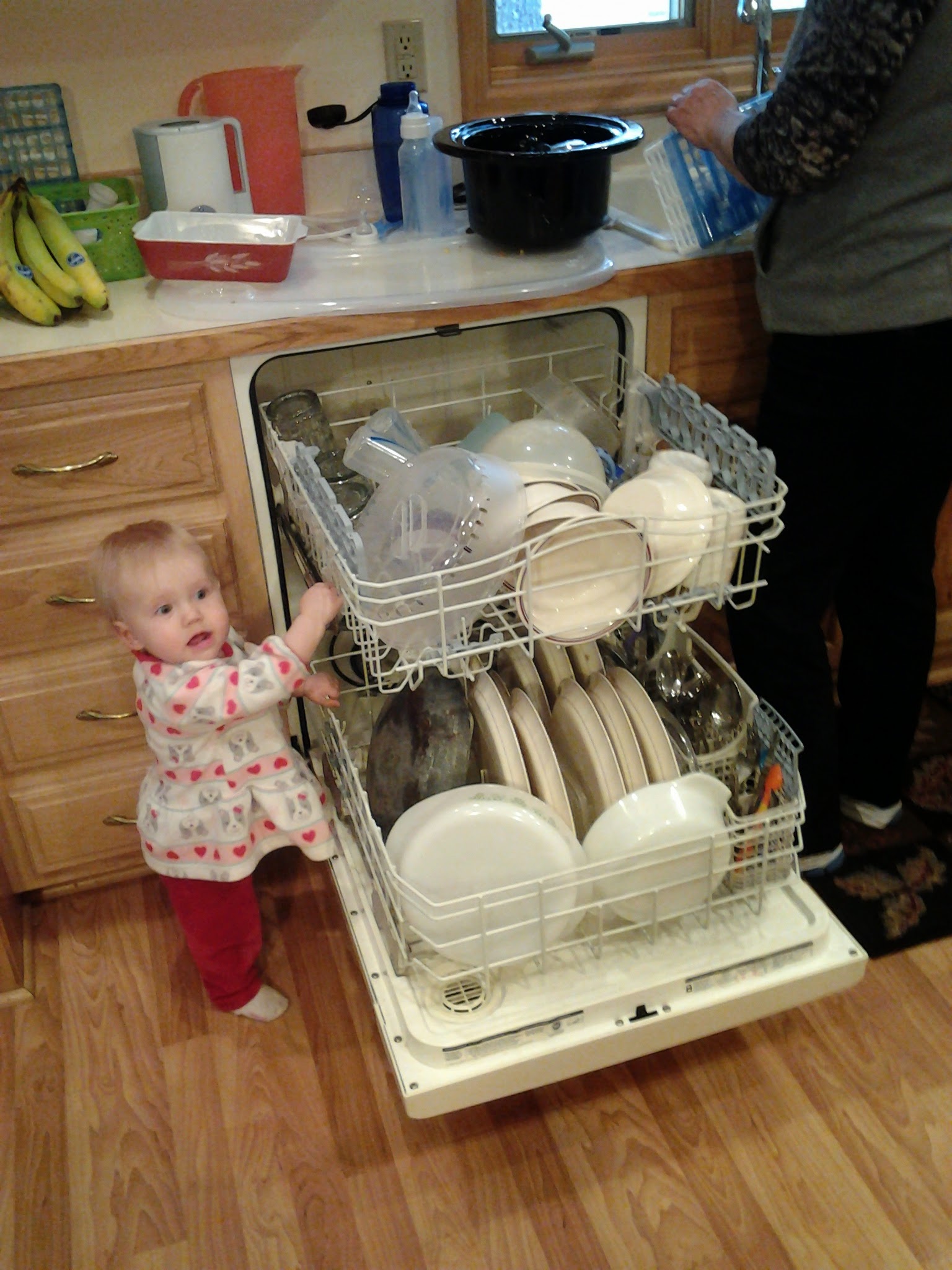 And she still loves playing in the dishwasher.