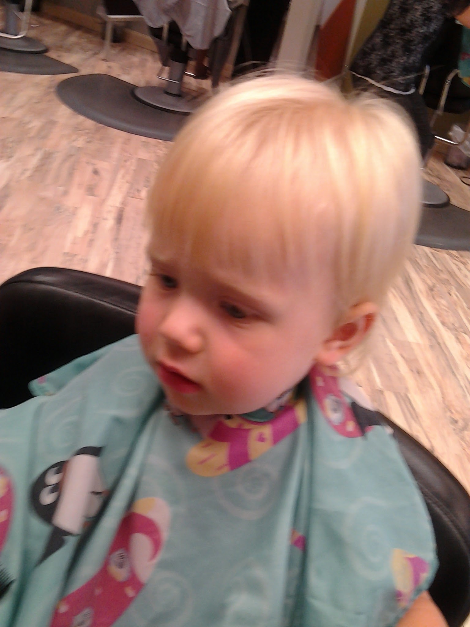 Something that did happen this month is that Emma got her first and second haircuts! Travis and I trimmed her bangs one night, but since Emma was going to be in a wedding, I figured she should have a professional haircut. Well, I was very underwhelmed by the pro haircut (we went to Great Clips), but Emma did great sitting in the chair.
