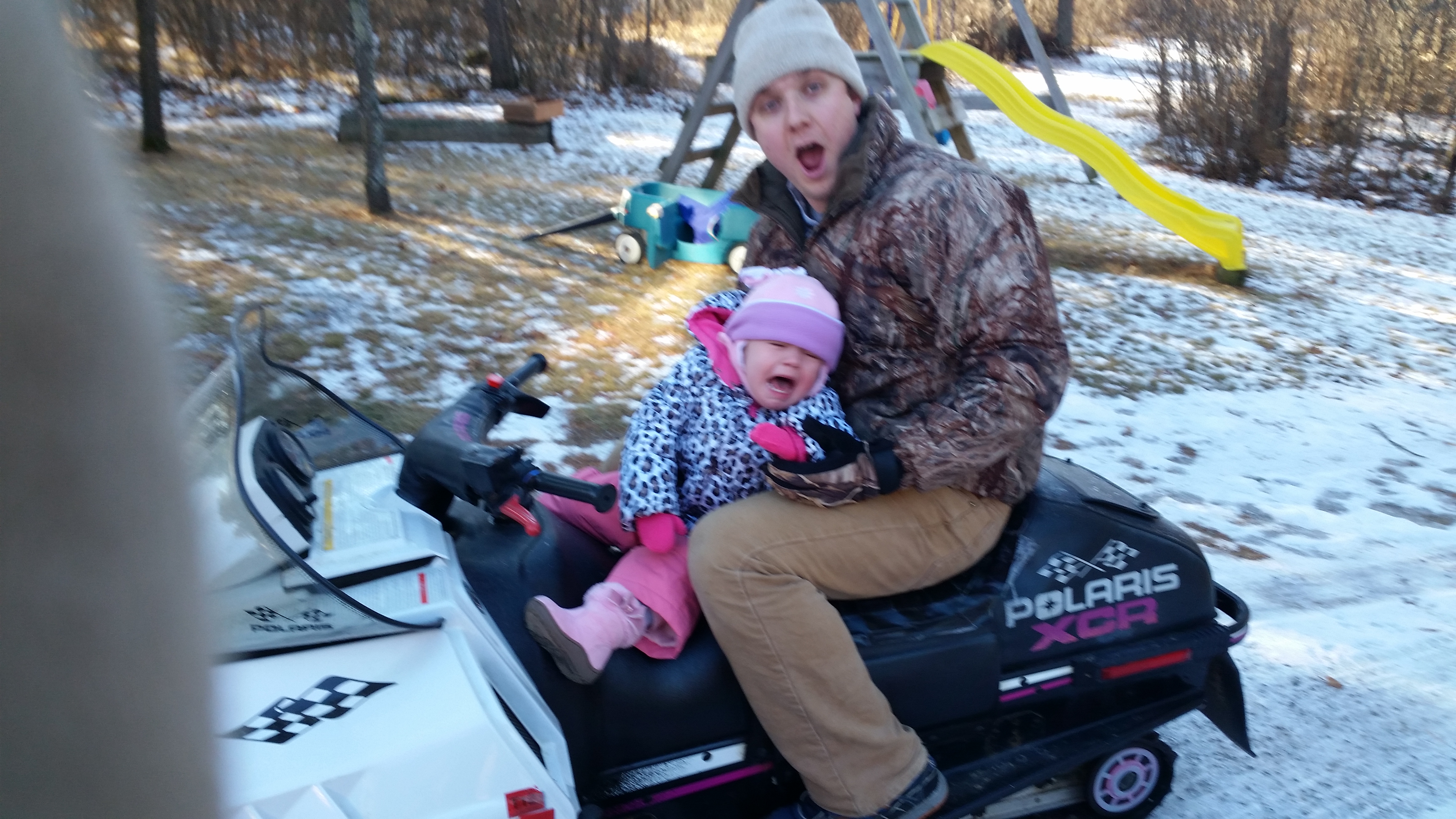 We stayed up in Nevis until Emma’s naptime on Sunday, and spent our time just hanging out. Emma took a very short ride on the snowmobile – she didn’t mind it during, but when we put her back on the snowmobile to take a picture, she freaked out: