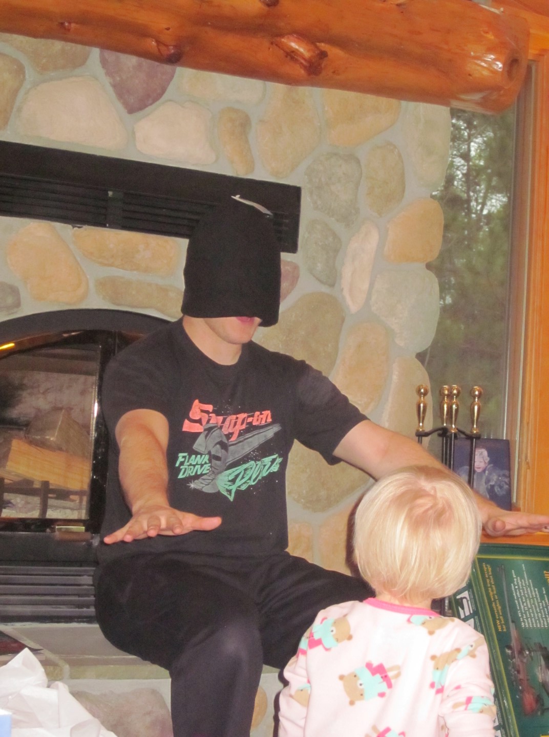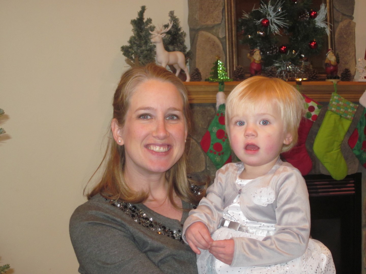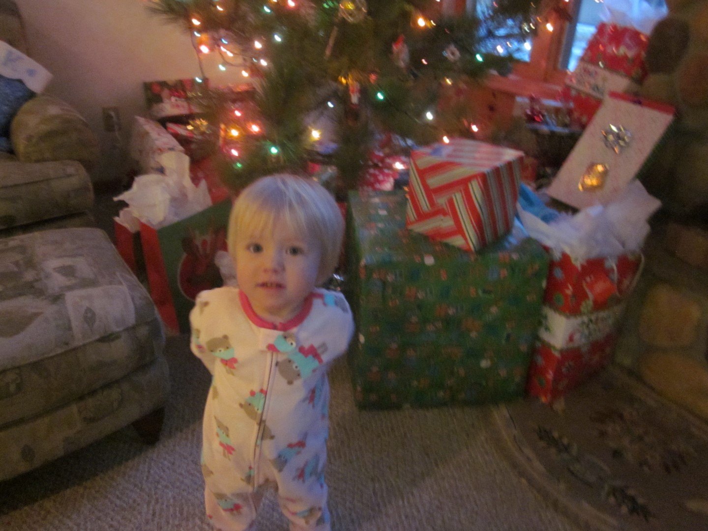 We haven’t completely decided on what we’re doing for gifts each year for Emma (and future siblings) but this year, we did the “Something to Wear, Something to Read, and Something to Play With” approach. So we bought Emma some fleece pajamas, three of the Bear Snores On books (it was a pack through Scholastic), and a tent/tunnel. Since my family always celebrated Christmas on Christmas Eve, but Travis’ did Christmas morning, we’re thinking about doing one gift (the Something to Wear) on Christmas Eve, and the rest Christmas morning. So that’s what we did this year. Emma opened her pajamas Christmas Eve, and the rest Christmas morning. Though she got so many presents from Travis’ family that she totally lost interest in opening them!