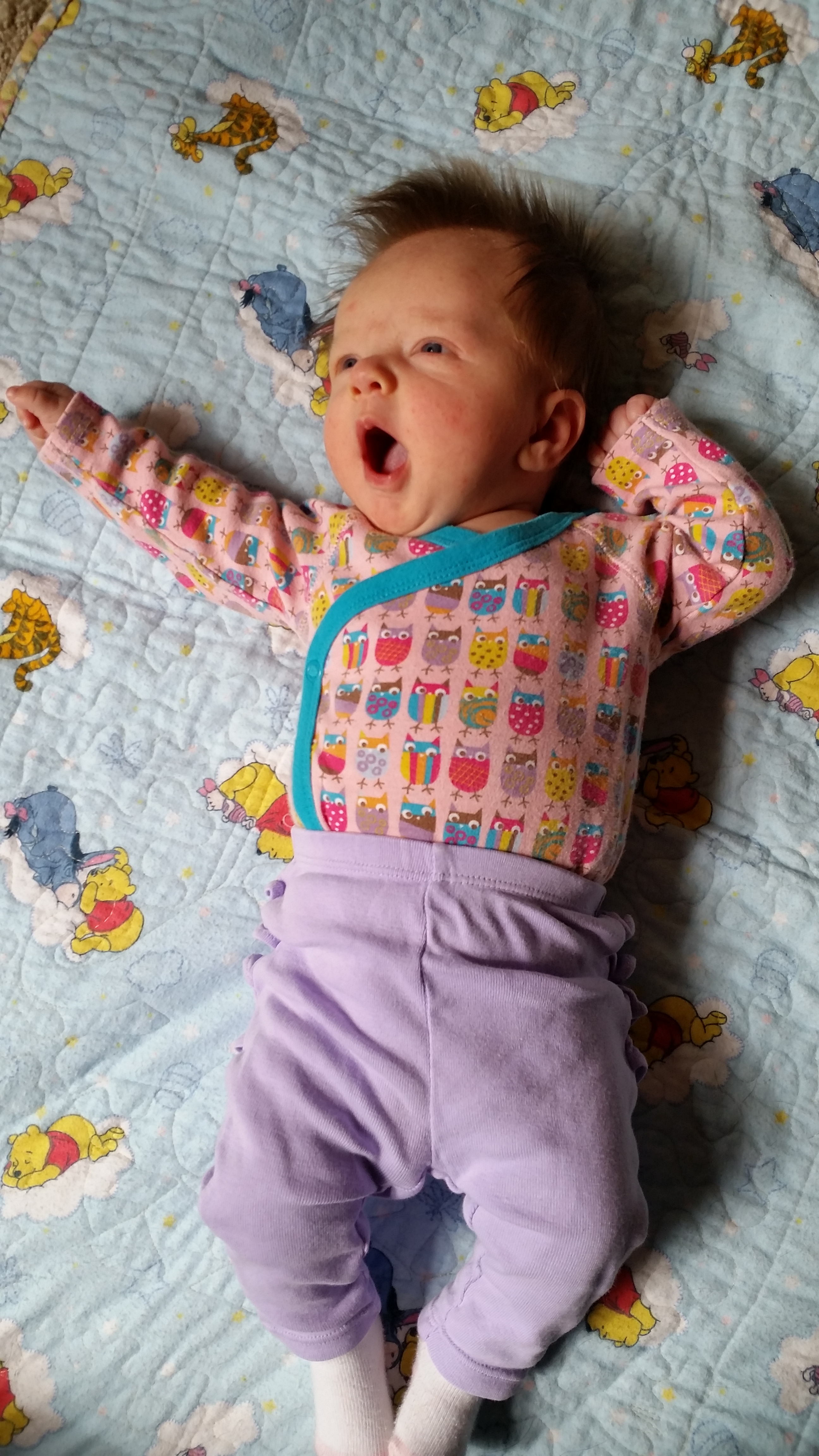 Annabelle is still nursing well — we’ve hit our nursing stride, I guess you could say. She nurses about every 3 hours during the day. In the evening, she often nurses more frequently for comfort. She’s doesn’t like a pacifier and so far, has only taken a bottle once. We’re going to keep working on it, but maybe she’ll go straight to a sippy cup?