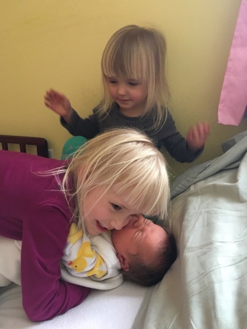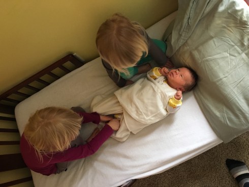 I will say that the hardest thing about having a newborn this time around is not the newborn himself, but our other kids. Two kids was a juggling act, and three is even more so. It is very helpful that the girls are as old as they are. Emma can get snacks and drinks for her and Annabelle while I’m nursing (as long as she’s in the mood to be a helper and not a helpee), and Annabelle is about 75% potty trained, so we don’t have to change her diapers/pullups very often.