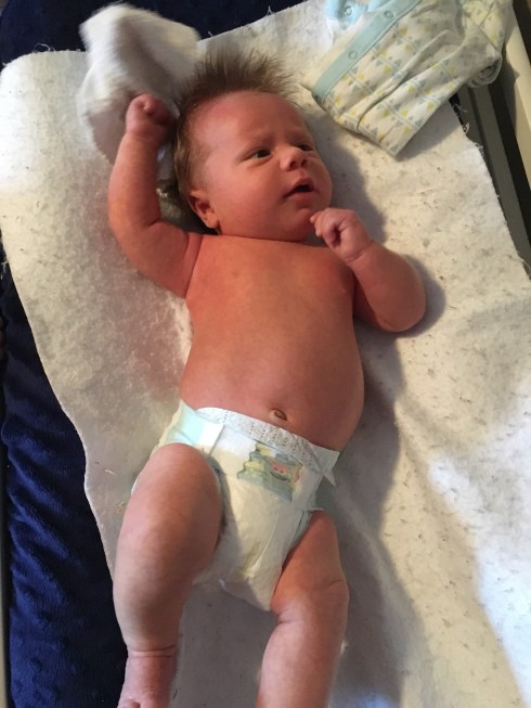 Shortly after he was 2 weeks old, Corbin outgrew his newborn clothes, and is now wearing all 3-month size. He has also been wearing size 1 diapers since we came home from the hospital, and I’m contemplating moving him to size 2 already…