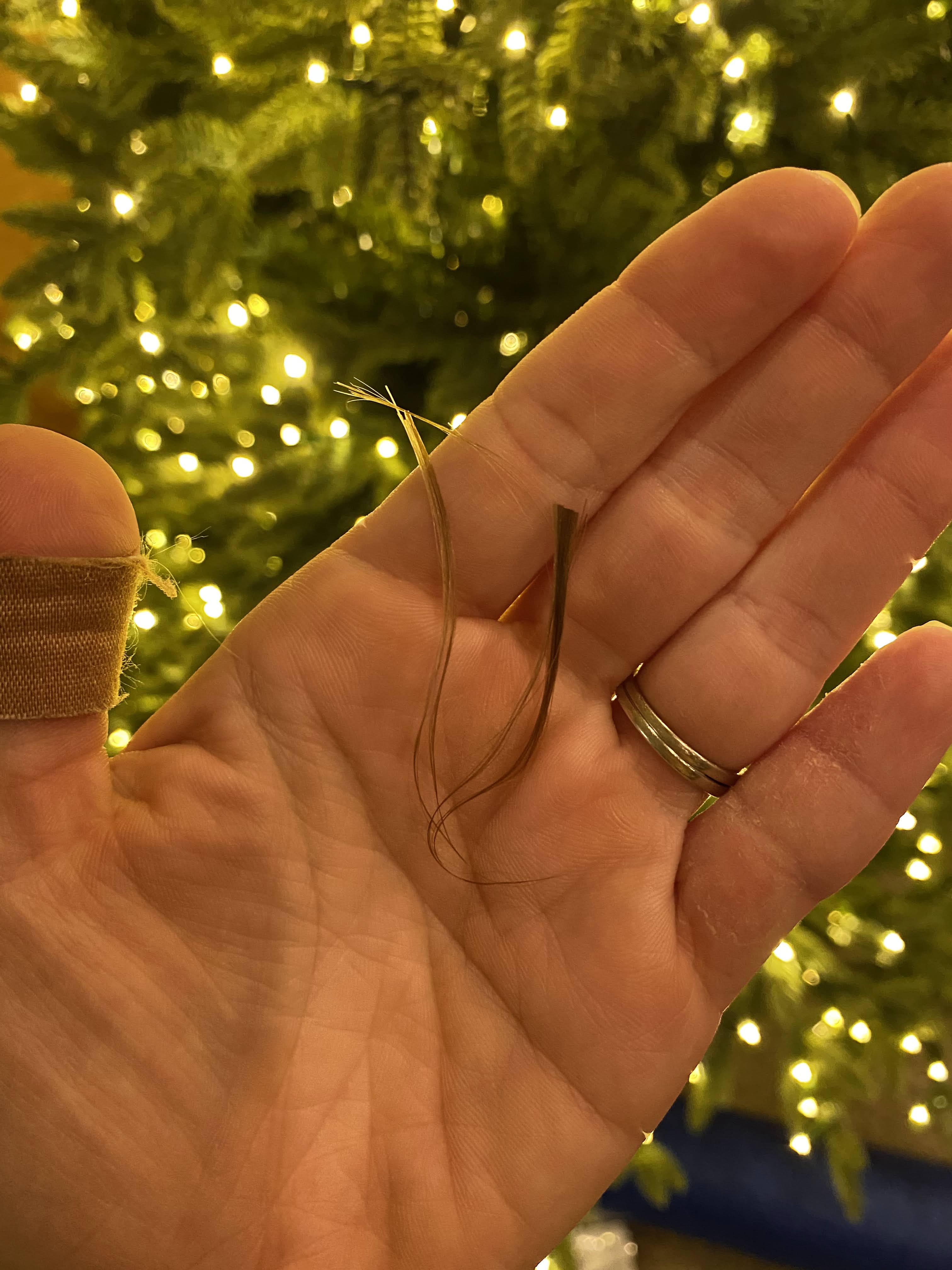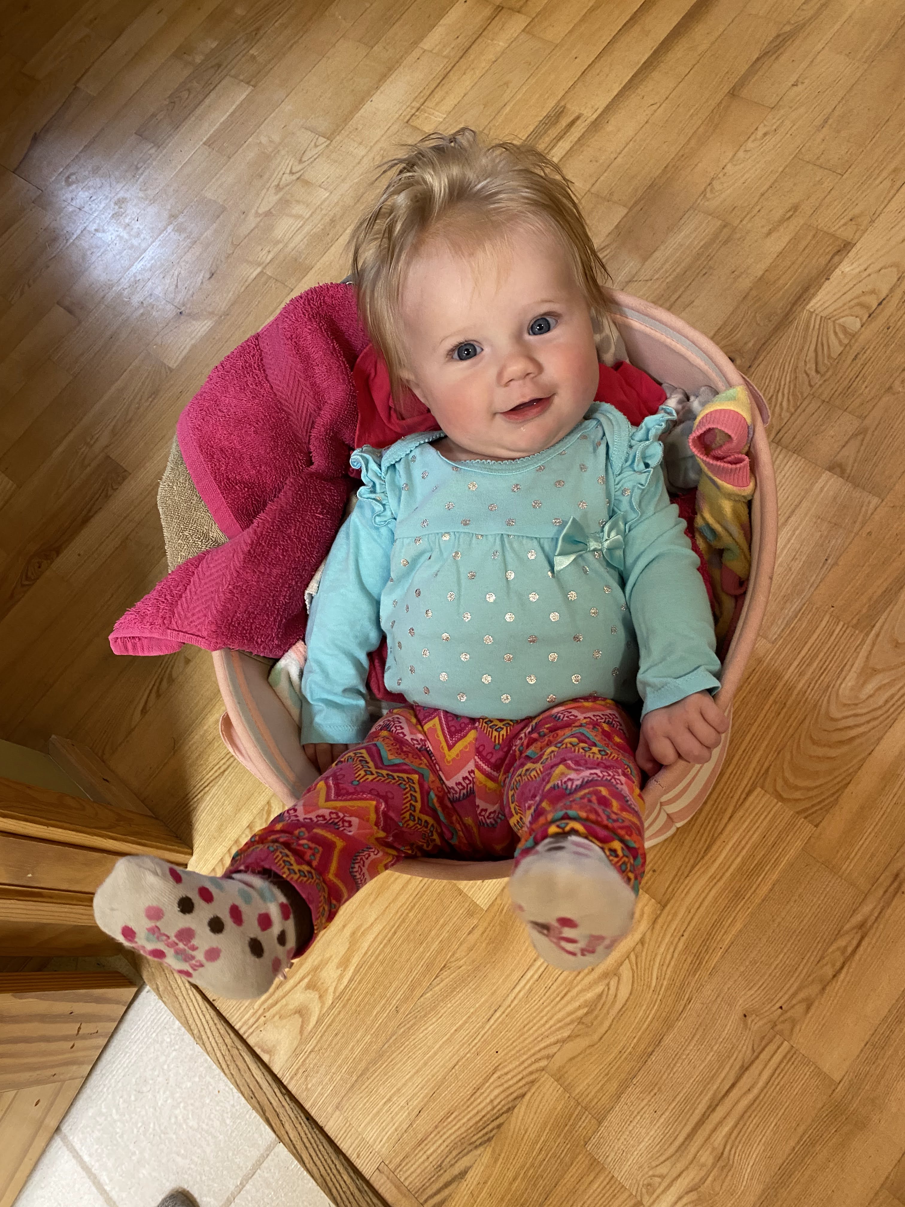 Neola got her first haircut right around 6 months. The back of her hair has mostly been rubbed off by her turning her head back and forth when she’s trying to go to sleep. The top of her hair can’t figure out which way it wants to lay (but if you comb it over after a bath, it does mostly lay that way). But her sideburns! They were down past her ears. 😂 So I trimmed her sideburns to be above her ears, and trimmed a tiny bit off the top of her hair.