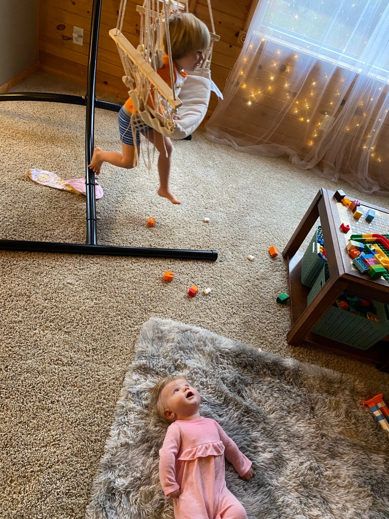 For naptime, we still swing her in our indoor chair hammock, or get her to sleep in her carseat, either by pushing her around in the stroller or swinging/carrying her carseat around. She doesn’t fall asleep nursing during the day as much as she used to, which is probably good for the long term, but I am soooo sick of swinging her in the chair hammock. I have tried different strategies of putting her down after getting her to sleep, and am often successful in transferring her, but she almost always wakes up after 5-10 minutes.