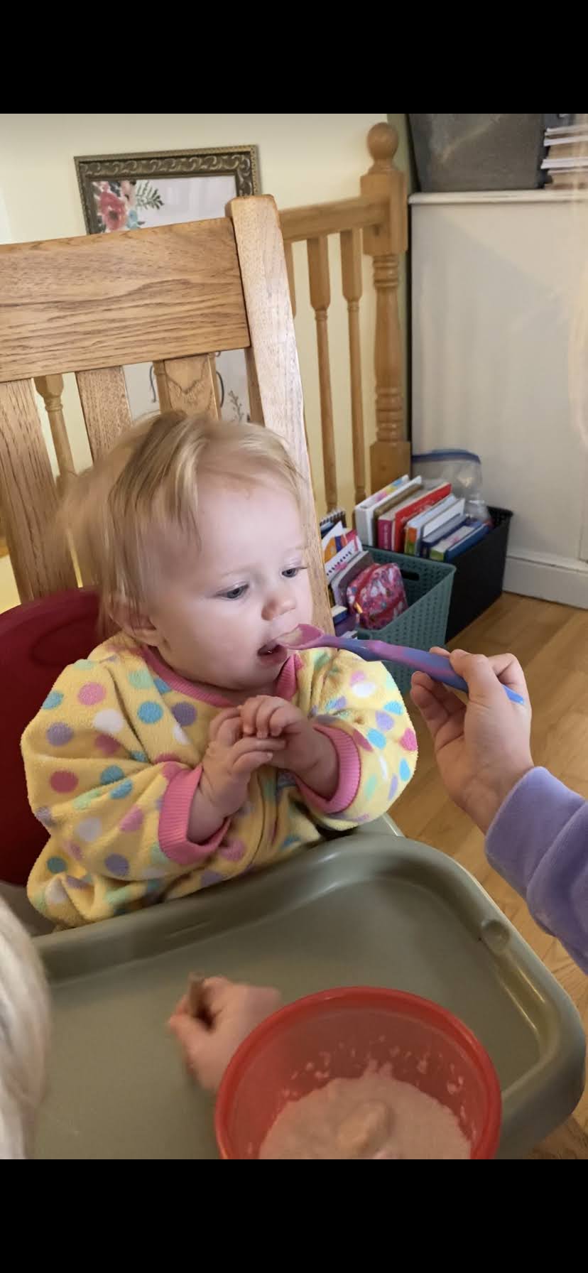 She has also tried avocado a few times, which she seemed to like, but maybe not as much as the cereal. In the next week or two, we’ll try giving her banana and yogurt.