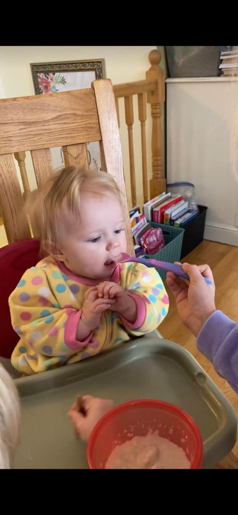 I also mentioned that we started her on baby cereal. Emma and Annabelle are all about feeding her! Neola did great. At first, she just wanted to grab the spoon because she thought it was a toy but by the end of that bowl, she was eating like a champ. Neola has grown to not like formula, and we haven’t given her a bottle since the end of August, so it will be nice that she can eat without always being nursed now.
