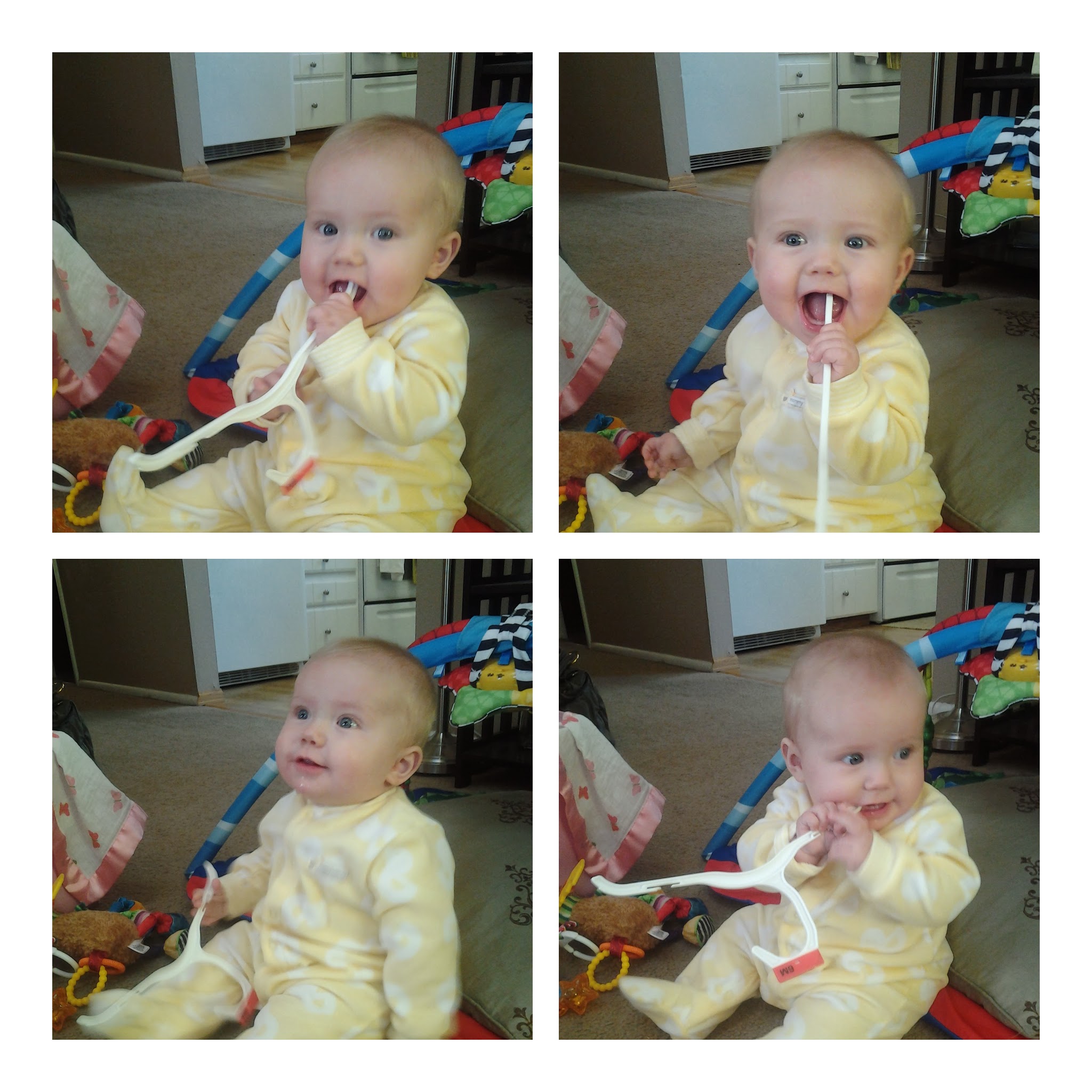 Neola seems to be getting tired of the same old baby toys. We are definitely in the phase of “What other random thing would be safe for me to give you to chew on?” Like this bottle of lotion. Or that marker. Or this Ziploc bag. Or an empty disposable water bottle (cap and ring removed). She, like most kids, is most interested in the forbidden things, like my water bottle or protein shake cup — especially when they have water or shake in them! If I take a drink while holding her, I have to pin her arm down so that she doesn’t reach up and grab it, causing me to spill.
