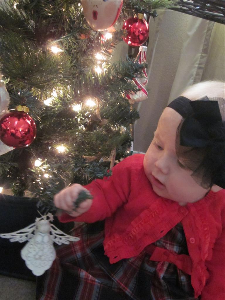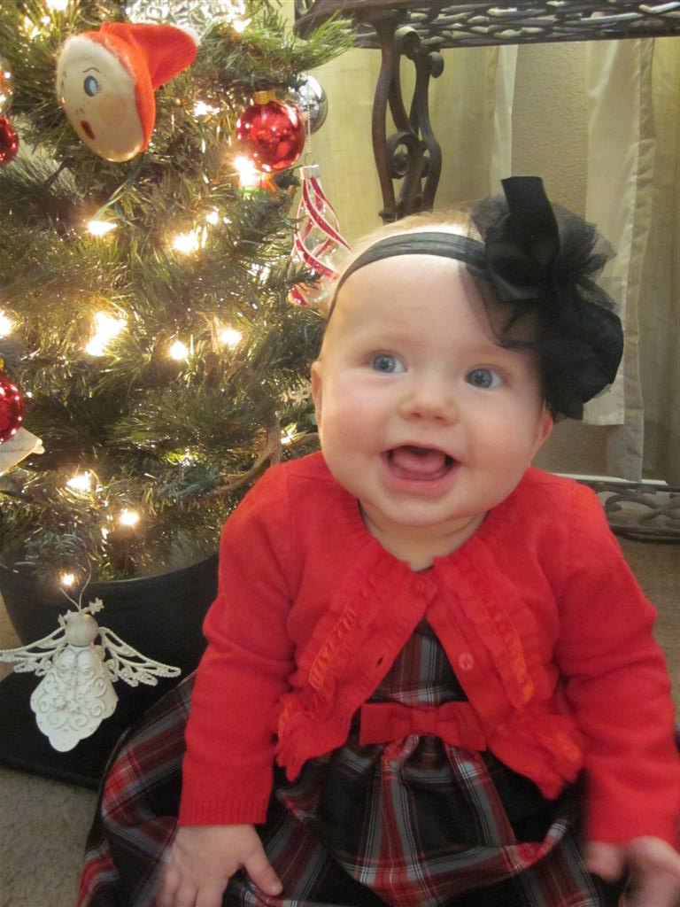 He loves to shriek and talk, but it is really hard to get him to laugh. He only laughs if he finds something absolutely hilarious. Emma is usually the one to get him to laugh, and usually it’s when she’s doing something that I wouldn’t think he’d even like, like hold him still in his outdoor infant swing up in the air facing down toward the ground. He thought that was hilarious. She also put these cone-shaped Christmas trees on her hands and Corbin laughed for almost 10 minutes.