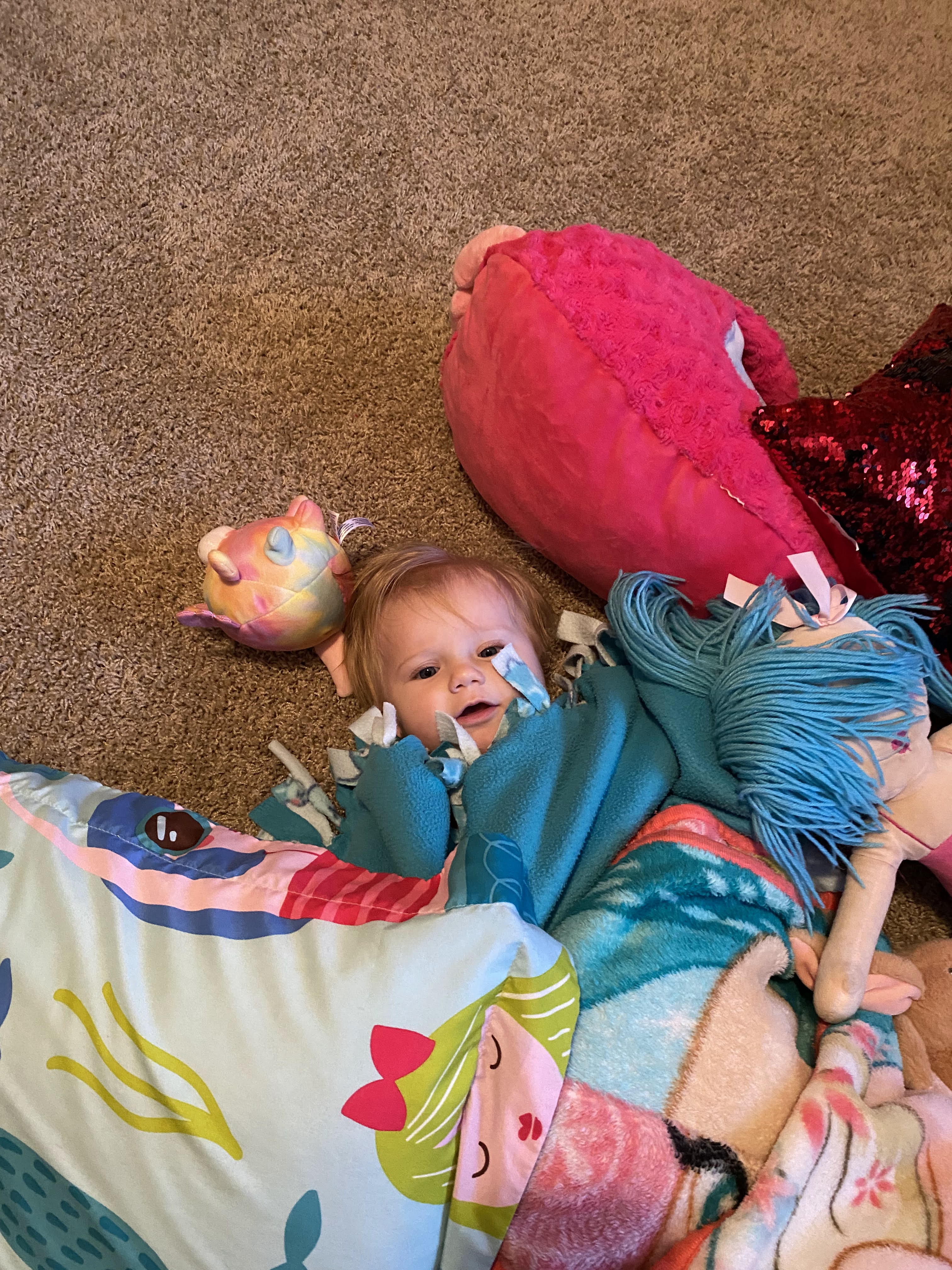 She also got blankets, pillows, and stuffies dropped on her from the top bunk (Annabelle); swung outside in her pink swing without being able to see anything (oops); and tried on swim goggles (hilarious). She didn’t cry at any of that! Such a good sport.