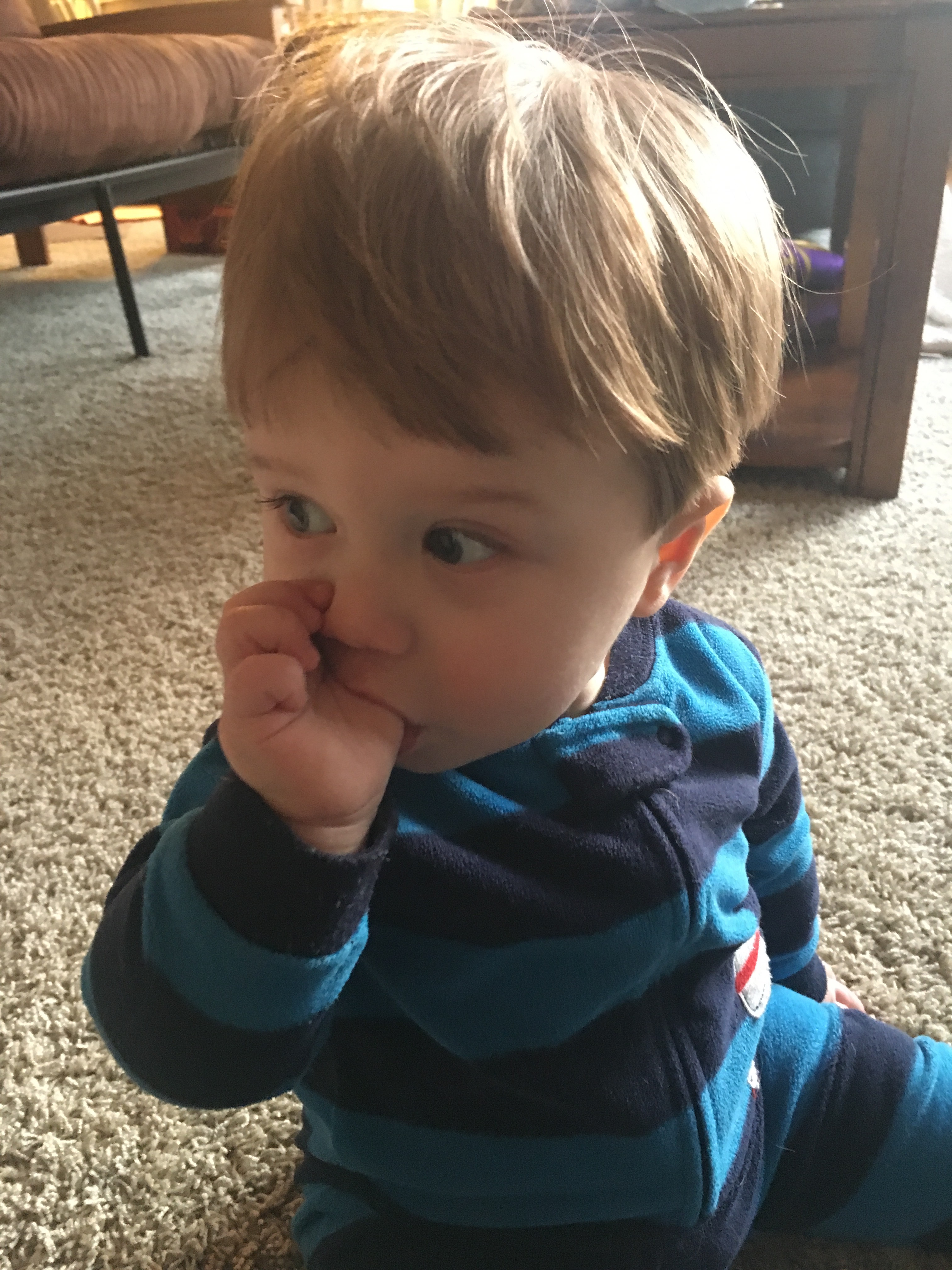 But in general, he’s a moving target. And for the past couple of weeks, he’s been having blowouts several times a day, so we’re wondering if he’s lactose intolerant like Annabelle. (He usually drinks lactose free milk but we had run out and bought some regular milk from the gas station near our house. And now he’s also drinking regular milk at daycare.) But it could just be a diarrhea virus he caught at daycare. We still haven’t figured that one out.