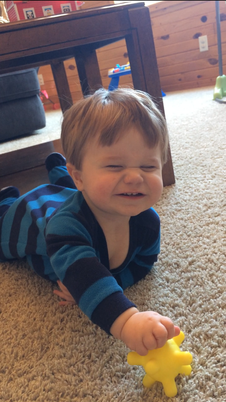Corbin is still army crawling, and he can be pretty stinkin’ fast when he wants to be! He also gets up on his hands and knees, and rocks back and forth, but hasn’t figured out what to do from there. He can, however, now get from the crawling position back into the sitting position.img_1803 (large)He doesn’t pull up on anything yet, though there have been a few times when it seems like he wants/tries to. I think a main problem is a lack of surfaces for him to practice on. He is getting more stable standing on his own (while holding on to something), but he curls his toes under just like Annabelle used to do. If he hasn’t progressed by 11 months, we might have the physical therapist who worked with Annabelle come out and assess Corbin. It’s free and they come to your house! #winwin