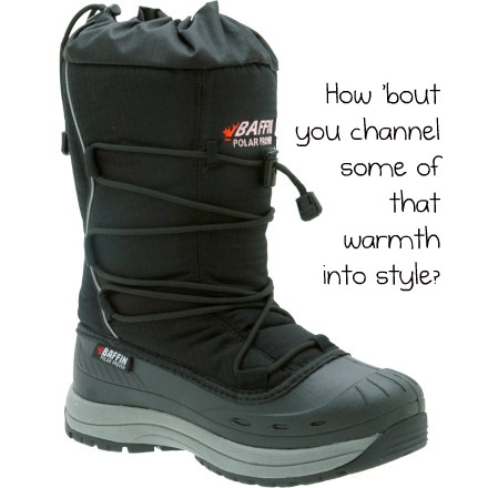 Travis’ cousin emailed us to say that he could get a great discount on new Columbia gear through the store he works at, but only through the end of the month. So I started looking at Columbia boots, and quickly discovered all of the cute ones only had 200 g of Thinsulate! (Travis said that 400 g would be a bare minimum.) Don’t these people know that a lot of women want to be warm and cute? (And actually, Columbia only carries one boot with more than 200 g of Thinsulate that I could see). As I looked at other brands, those too were only 200 g. The only warm boots I could find looked so… booty. Do cute, warm boots exist anywhere?