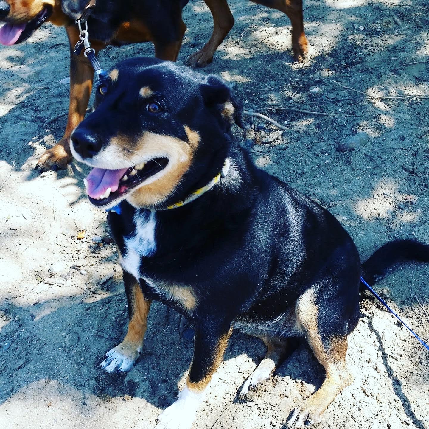 In June 2014, we moved into our current house, and about a year later, finally put in a in-ground fence. Katy was never one to run around on her own, but she liked exploring. At one point, she had a pustule on her belly that we were covering with old t-shirts, pulled into a knot on her back with ponytail holders. She’d go off exploring on the woods at my in-laws’ house and come back shirt-free. She and Charlie wrestled and play-fought, and she was always the leader on walks (whereas Charlie’s personality has always been more bungling, Eeyore-like, and “Squirrel!” ADD).