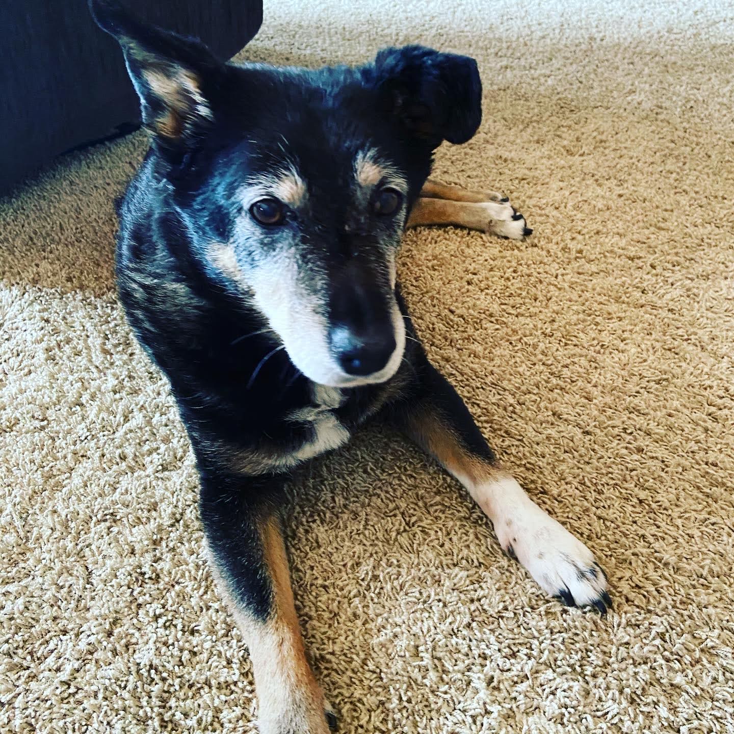 Katy was a fast learner, and a smart dog. She caught flies in her mouth, and was great at catching food too. She laid down on her belly, her rear legs tucked underneath her, and her front legs crossed like a lady. Both her ears stuck straight up, until she got a hematoma in her left ear one winter. The vet had to cut it open to drain it, and that ear never stood up again. Katy was prone to tooth decay, so in Colorado, we had her teeth cleaned every year (which required her to be put under). Our vet up here never thought Katy’s teeth looked bad enough to merit that.
